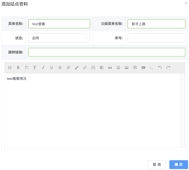 - 父级菜单名称:输入上级分类(如 新手上路)