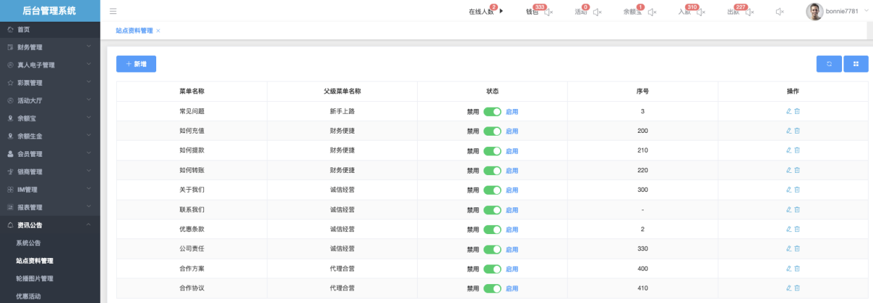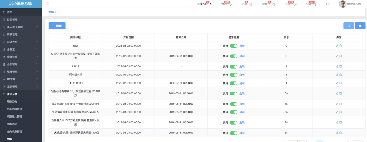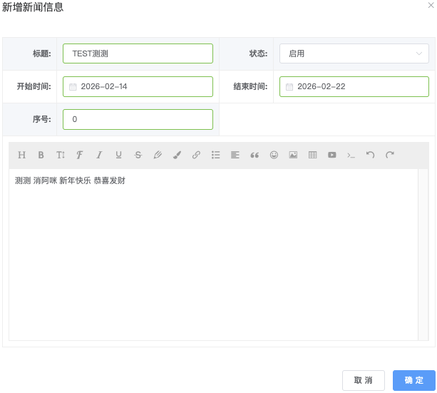 资讯公告管理模块用于维护平台前台展示的新闻、公告、活动资讯等内容。支持创建、编辑、启用/禁用、排序调整及有时效控制。