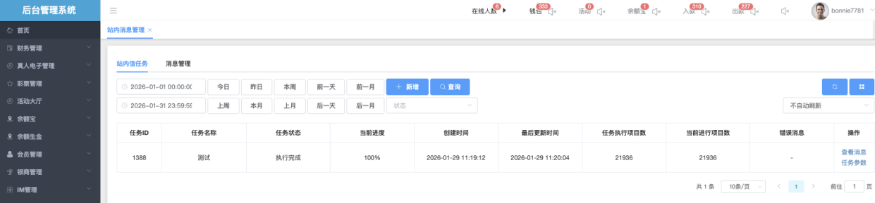 站内信任务管理模块用于创建和管理向平台会员发送的站内信任务,支持定向发送(指定会员)、批量发送或全站广播。支持富文本编辑、弹窗强制展示。