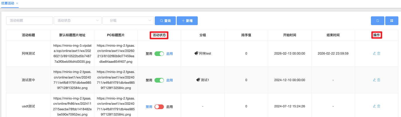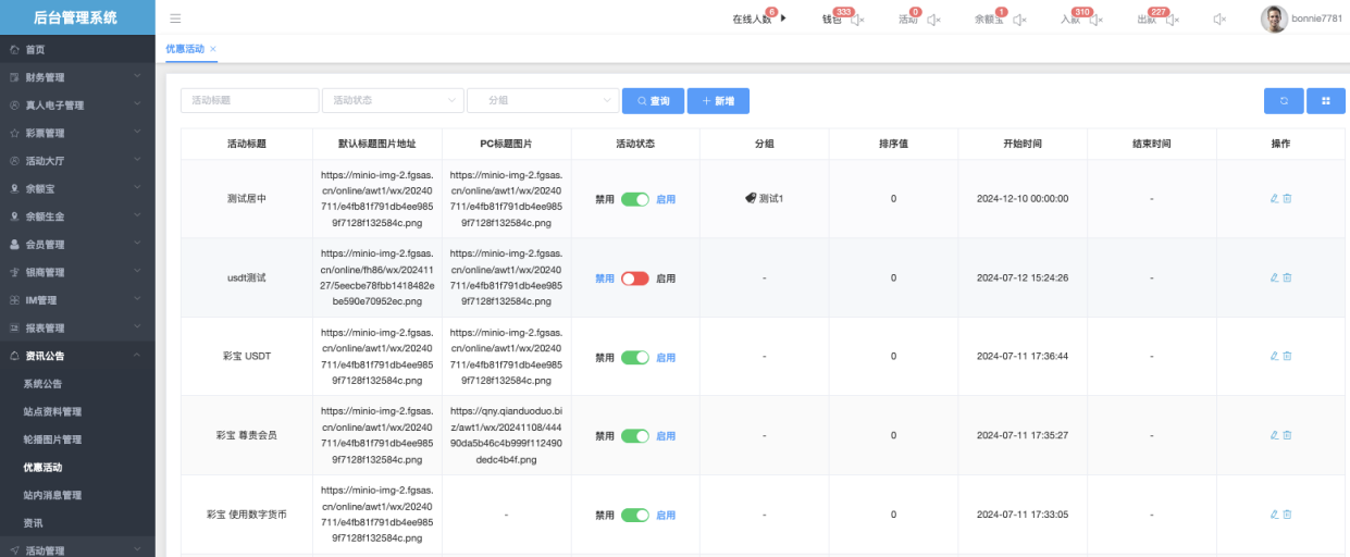 优惠活动管理模块用于创建、维护和控制平台(APP、H5、PC端)展示的活动入口,。管理员可通过本模块实现活动的快速上线、下架、排序调整及内容差异化配置,支持长期活动与有时效活动的灵活管理。