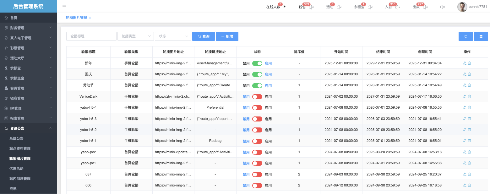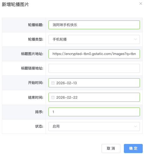 该页面允许管理员上传、编辑、排序、定时 轮播图,支持PC首页轮播与手机端轮播分别管理