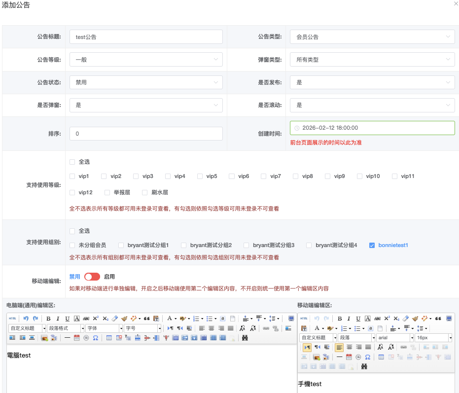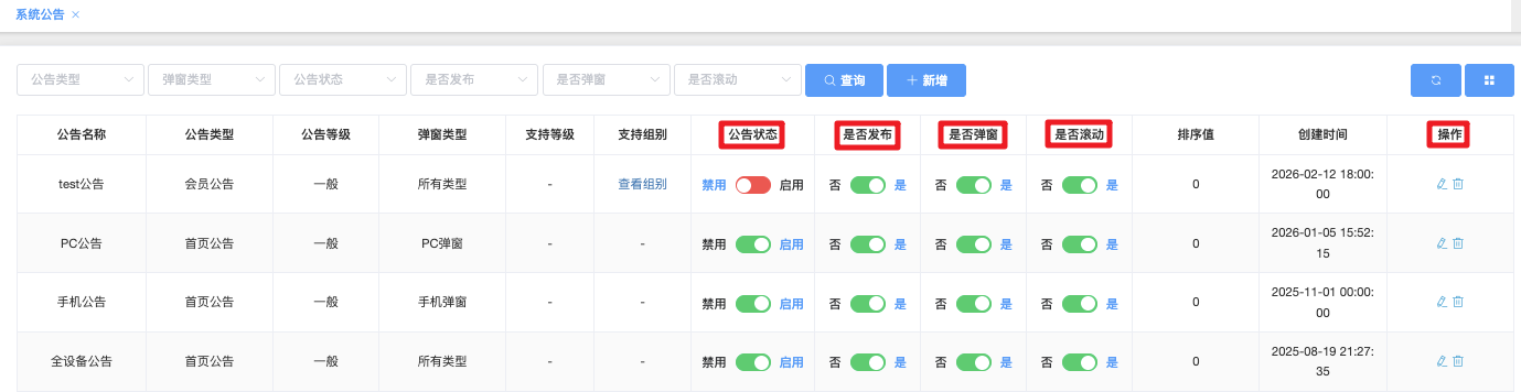 - 公告状态:启用 / 禁用