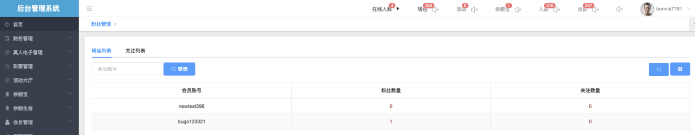 这个页面让管理员快速查看平台所有会员的粉丝数量和关注数量统计数据,帮助了解用户的社交影响力、活跃特征,以及是否存在异常社交行为。