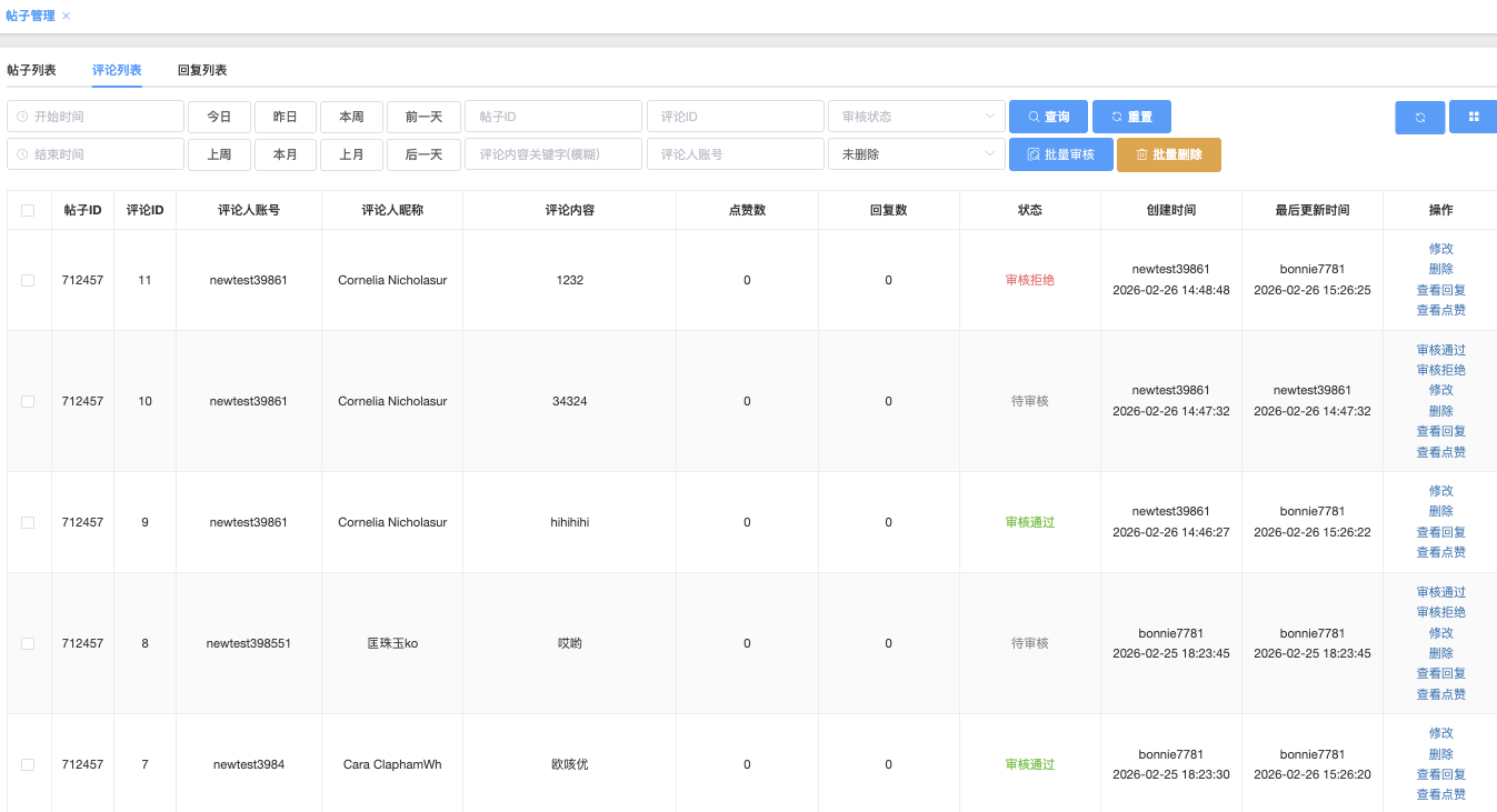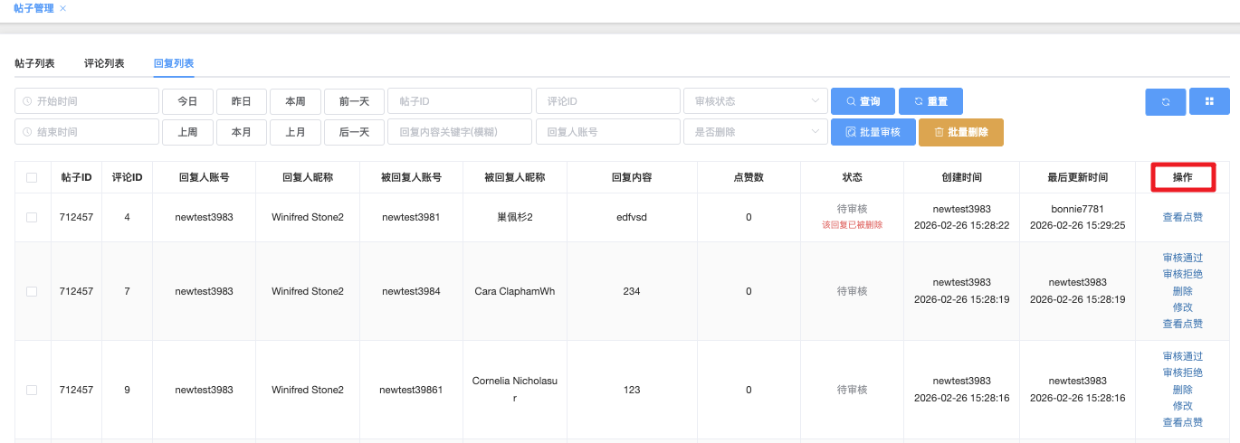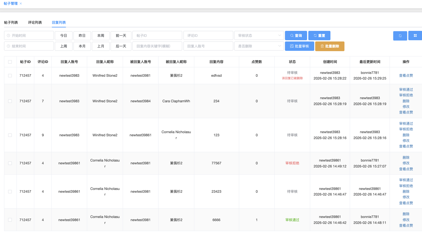 帖子ID/评论ID/回复ID:可入具体的帖子ID、评论ID 或 回复ID 进行精准查询(如 1)
