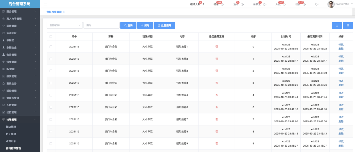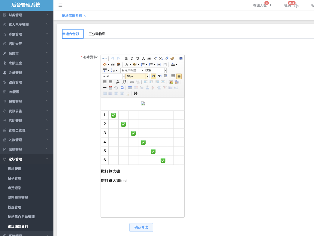这个页面用于编辑和管理论坛页面最底部显示的固定资料/心水推荐/杀号提示。管理员可以在这里直接修改显示的彩种、玩法标签、杀号表格(绿勾选择)、以及文字说明,并在修改后一键保存到前端显示。