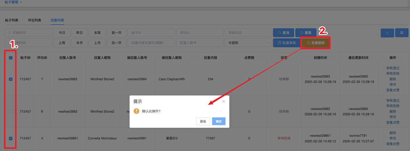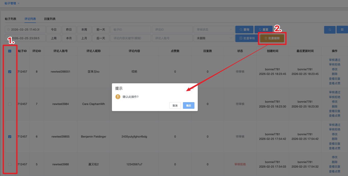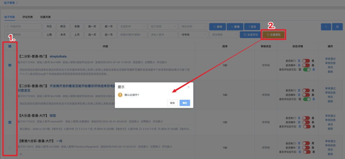 - 审核通过:点击后,弹出提示 确认此操作?,「确定」执行 / 点击「取消」放弃操作。