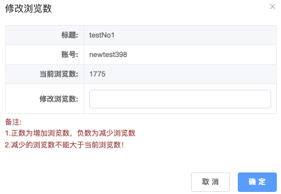 - 修改浏览数:点击后弹出「修改浏览数」,修改浏览数:填写数字为数量( 如 888)