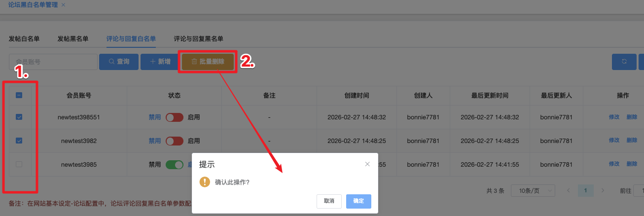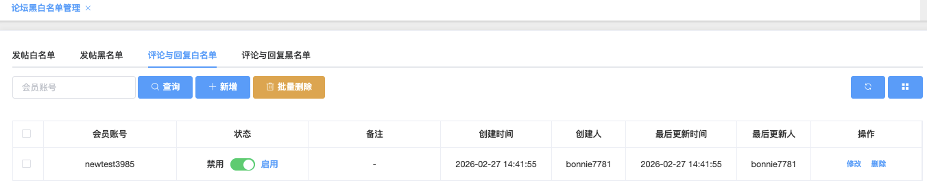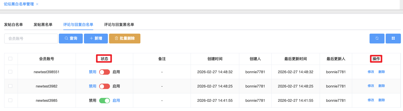 这个页面用于维护允许正常评论/回复的特殊会员名单(评论/回复白名单)。加入该白名单的账号即使触发论坛的评论频率限制、敏感词过滤、审核队列、新手限制等常规规则,也能自由发表评论和回复。管理员可在这里添加、切换状态、删除或批量管理这些豁免账号,确保关键用户不会被误限评论功能。