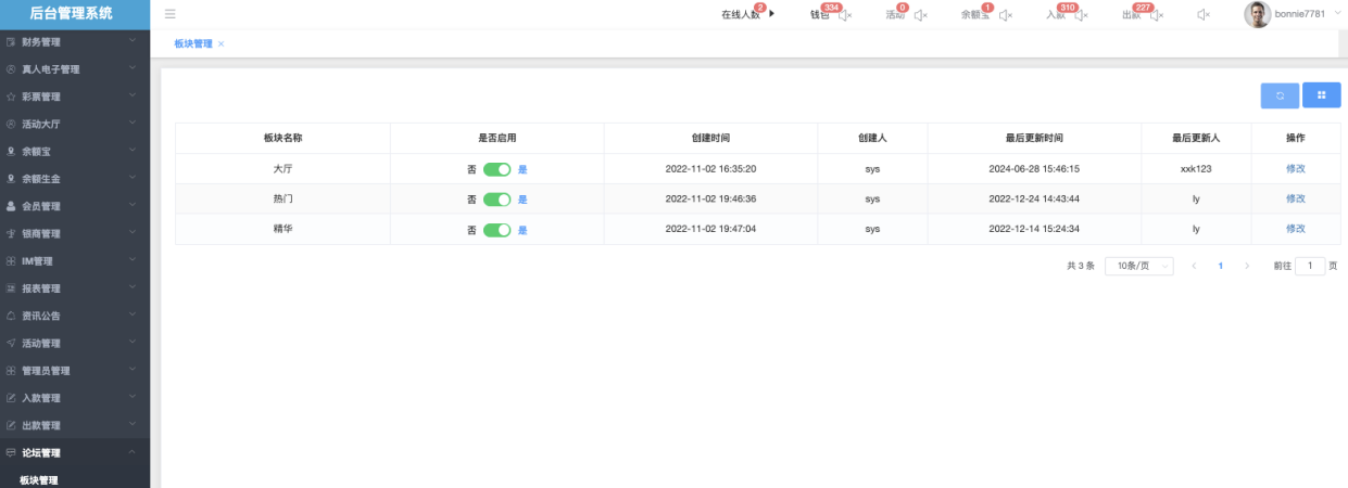 管理员可在这里查看、启用/禁用、修改、删除的各个板块(如 大厅、热门、精华),设置板块是否在前台显示、创建/更新时间 等。