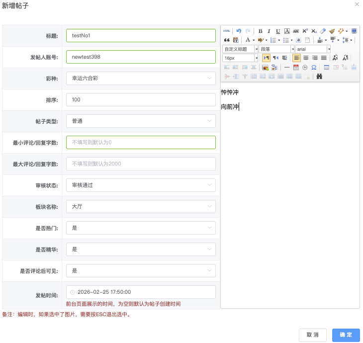 」弹出「新增帖子」窗口,需填写资讯