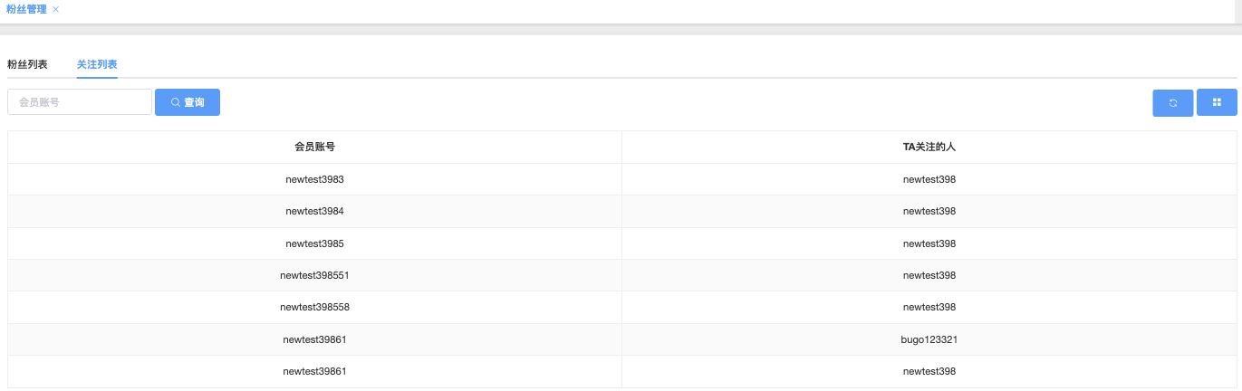 这个页面展示会员主动关注了哪些其他用户,帮助管理员了解用户的社交行为方向、主动性,以及是否存在批量关注、营销推广、互粉拉人等特征