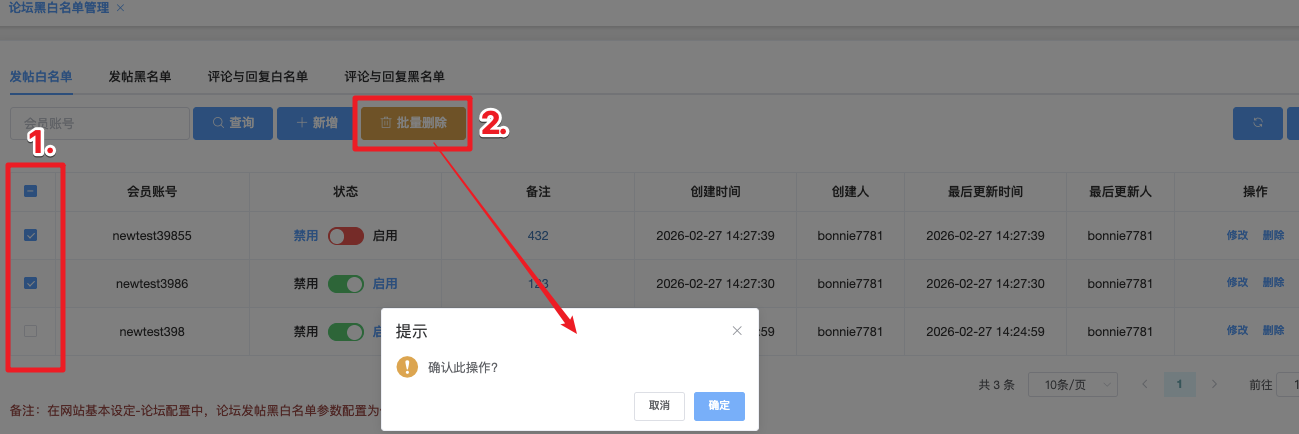 这个页面用于维护允许正常发帖的特殊会员名单(白名单),防止系统因某些规则误伤正常用户或重要账号。