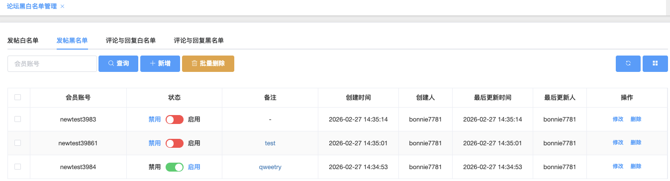 这个页面用于管理禁止发帖的会员名单。一旦账号被加入黑名单,该用户将无法在论坛发任何新帖,但通常仍可浏览、评论。管理员在这里添加、禁用/启用、删除或批量移除黑名单账号,用于处理违规用户、刷帖号、广告号、恶意发帖等。