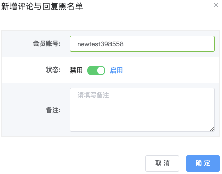 」弹出「新增评论与回复黑名单」窗口,需填写资讯