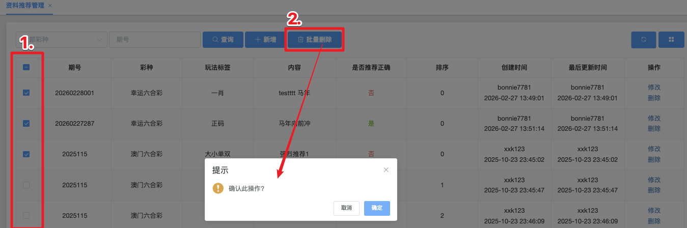 - 点击「批量删除」按钮,系统弹出确认窗口,显示:确认此操作?