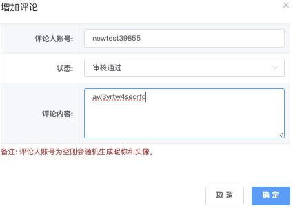 - 评论人账号:输入帐号(如 newtest39855)