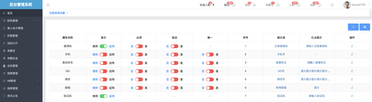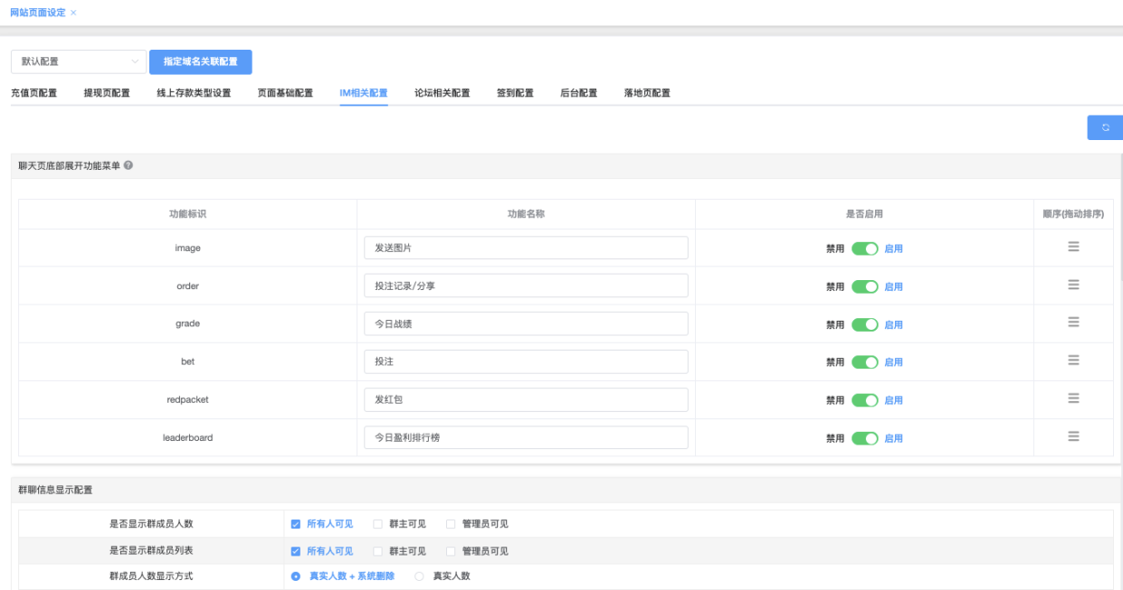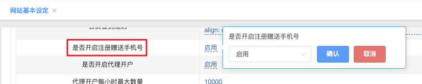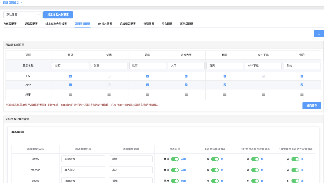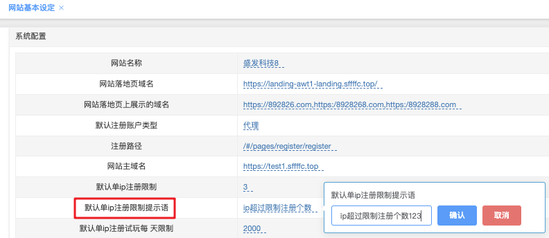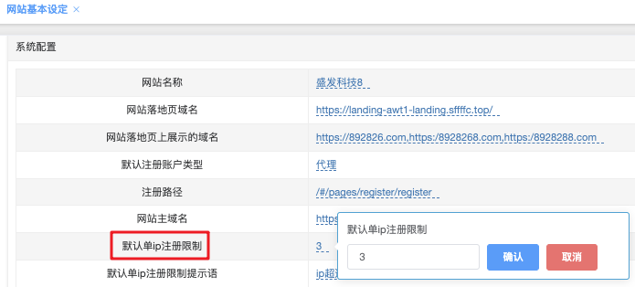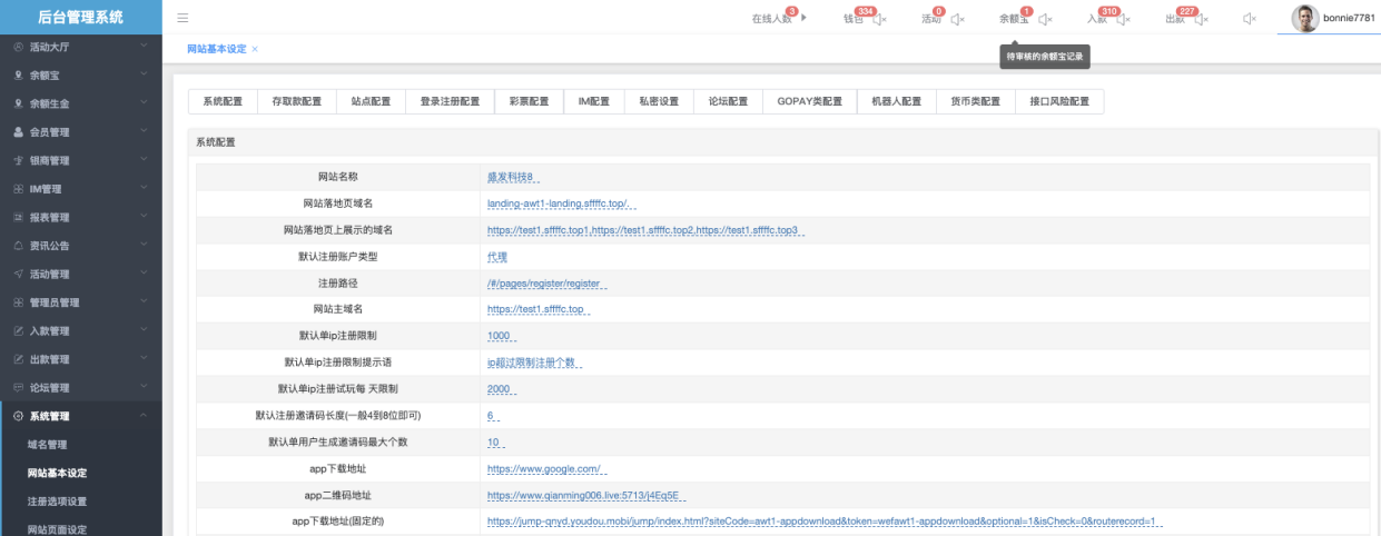 这个页面是平台最核心的全局基础参数配置中心,用于设置整个网站的名称、域名展示、注册规则、IP限制、邀请码规则、APP下载链接等基础信息。这些设置直接影响前端用户看到的网站信息、注册流程、访问限制、推广行为等,是运营上线、渠道推广、风控调整时最常修改的页面。