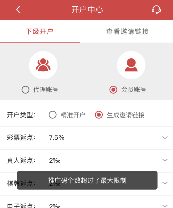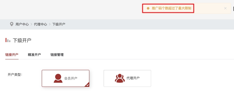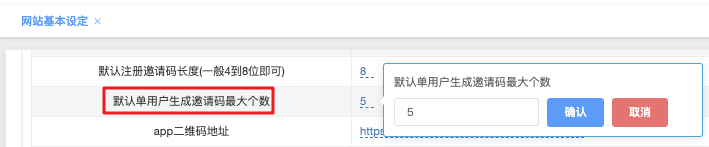 ⚠️ 特别说明: 当用户生成的邀请码数量达到上限后,继续新增时前台将弹出提示「推广码个数超过了最大限制」。
