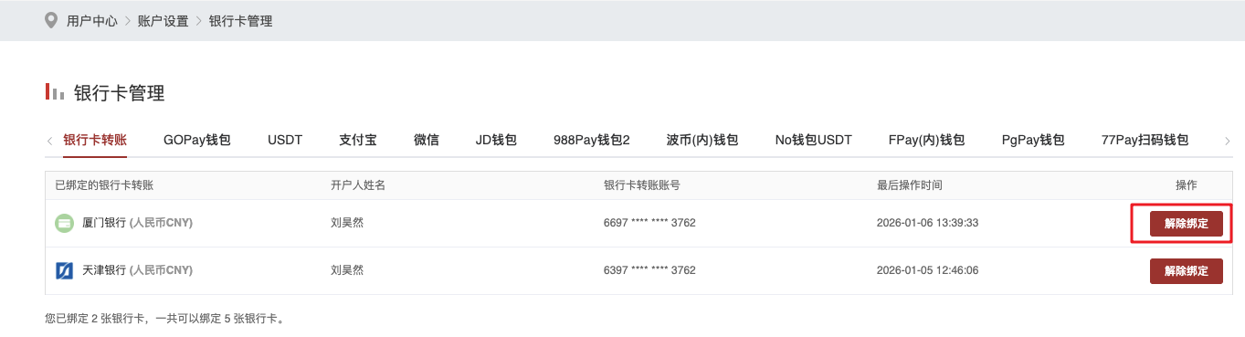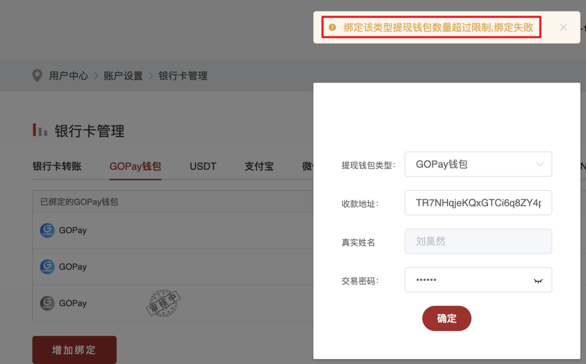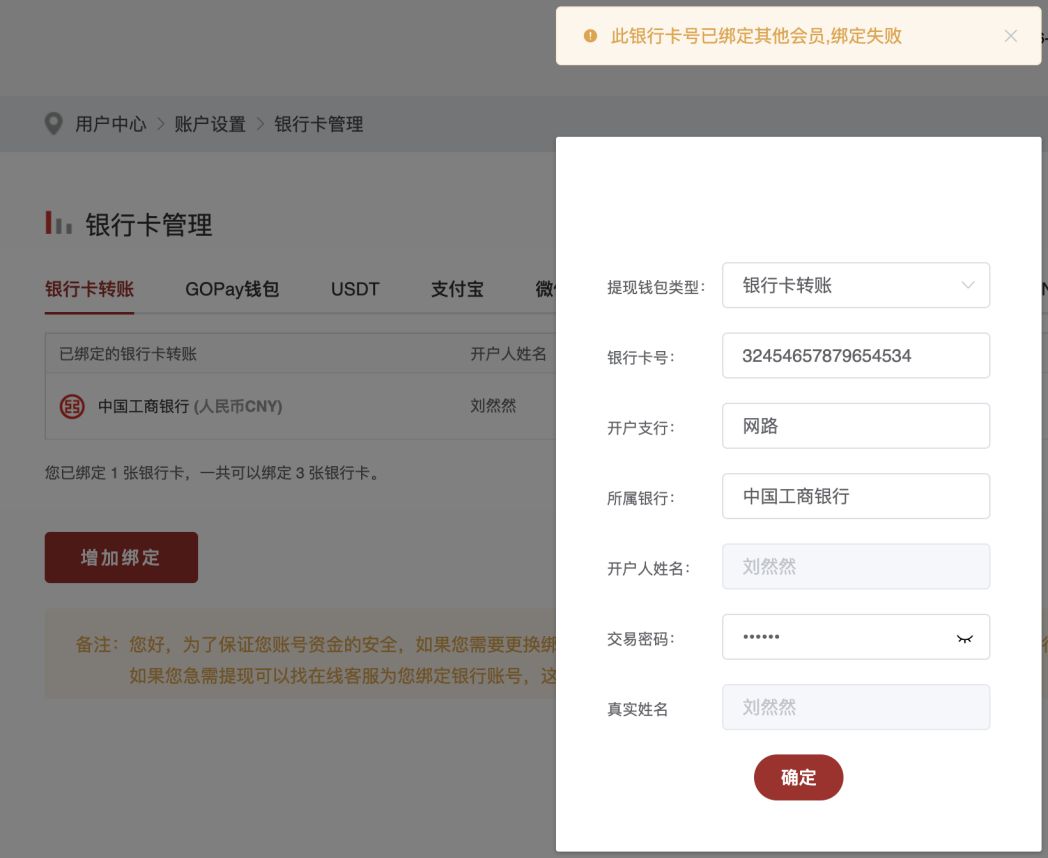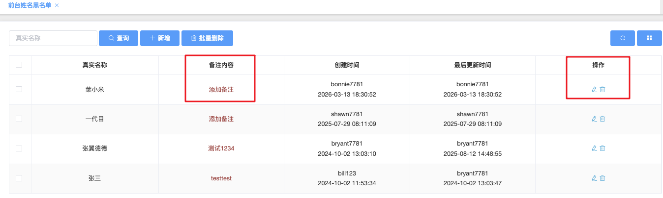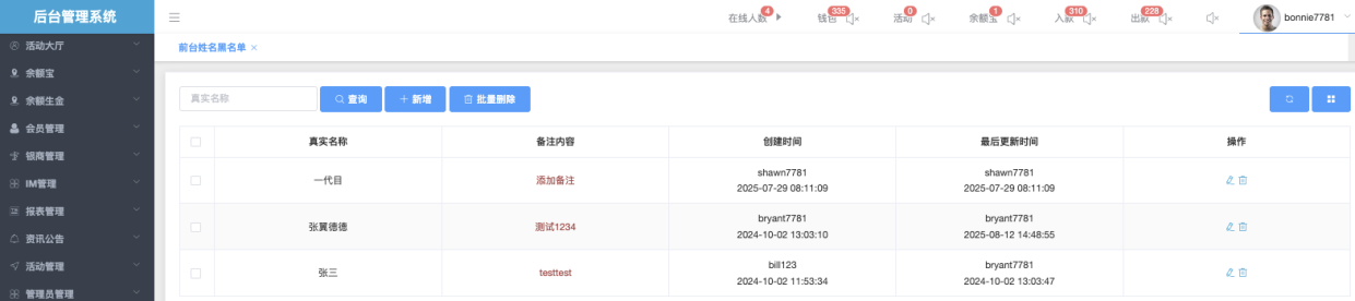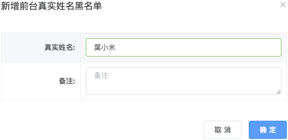页面用于管理被封锁的真实姓名,列入黑名单的姓名将无法在前台进行注册或绑定实名认证,适用于封锁已知风险人员或测试账号