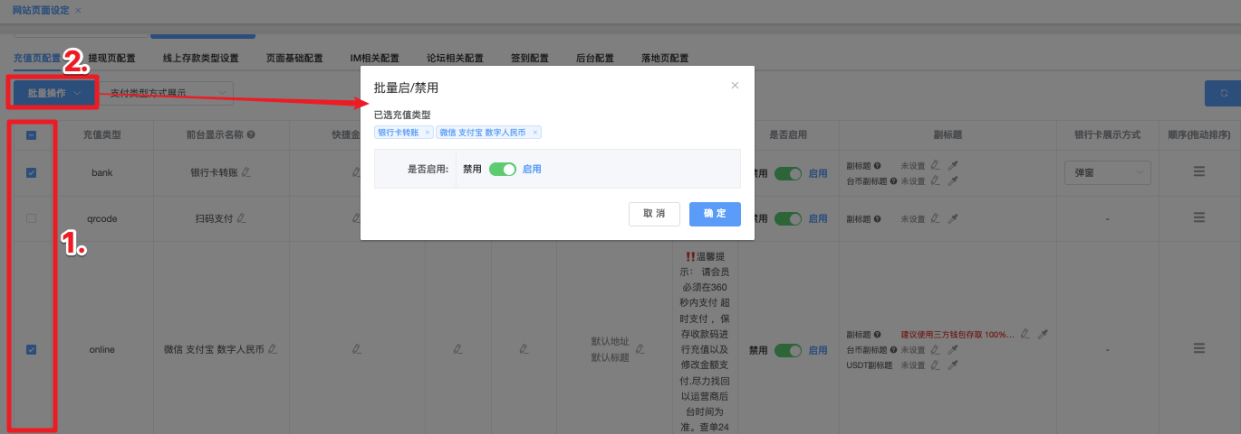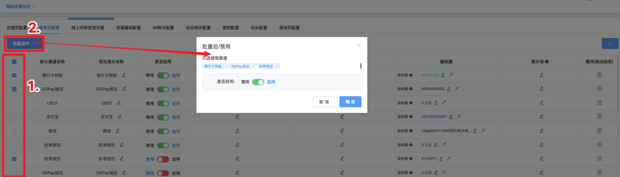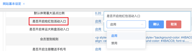 ⚠️ 特别说明: 设定为「启用」时,前台Web版左下角及H5版左下角均会显示红包入口图示;设定为「禁用」时,该图示将从前台完全隐藏。