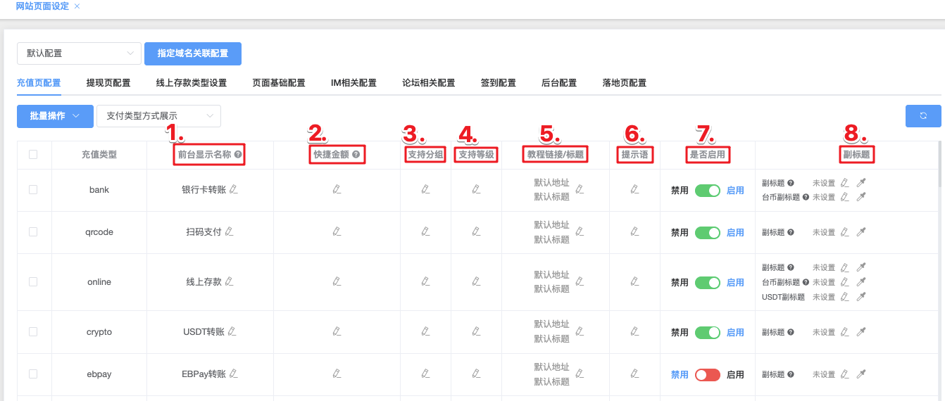 *以下点击右侧蓝色「文字」/「数值」 → 进入编辑模式,直接输入或修改内容,对于开关类选项 → 点击可切换「启用」 / 「禁用」或「是」/ 「否」状态。