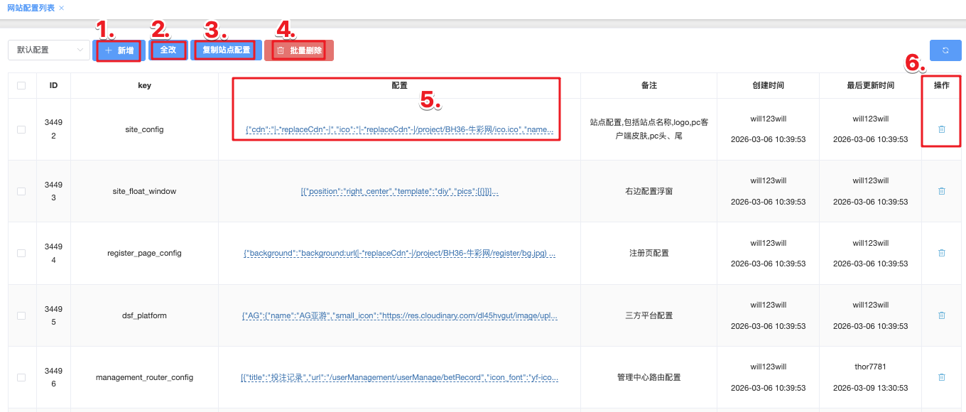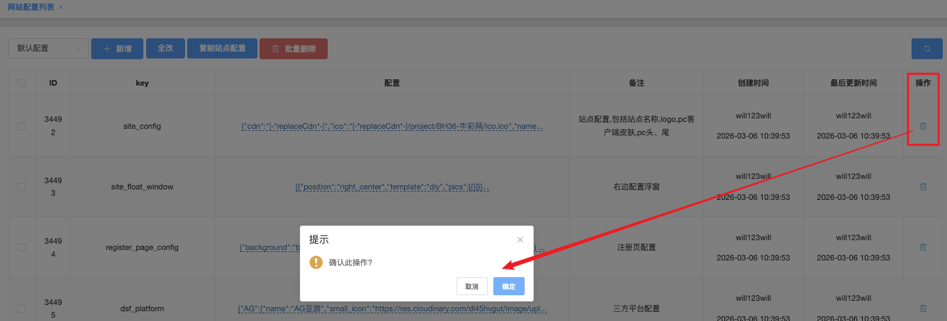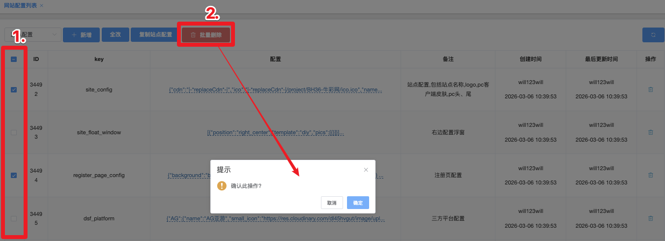 勾选列表中需要删除的配置项,点击顶部「批量删除」按钮即可一次性删除多条记录。删除操作不可还原,请谨慎操作。