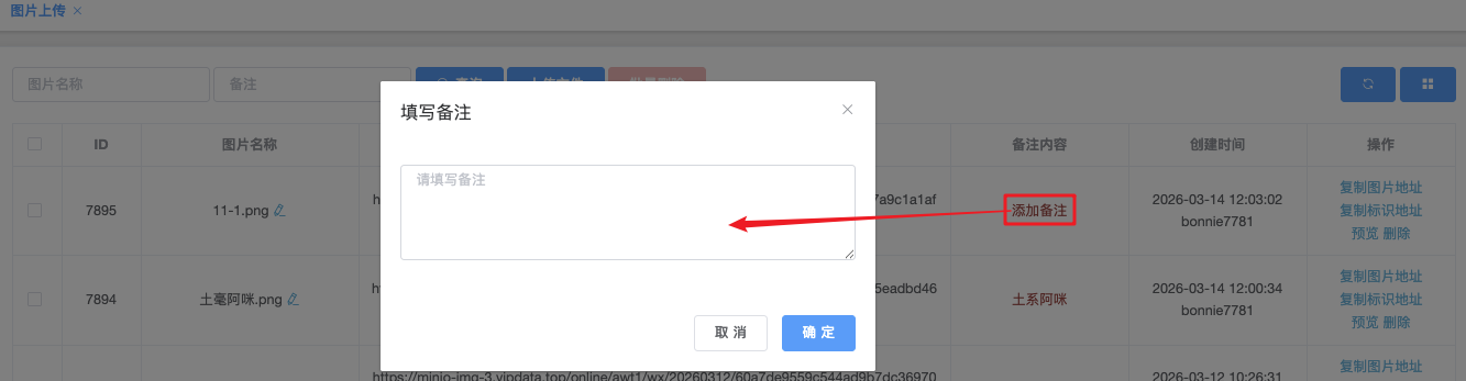 - 列表中备注内容显示橙红色「添加备注」,可点击弹出「填写备注」窗口,输入说明文字后点击「确定」保存。*便于日后管理与查找。