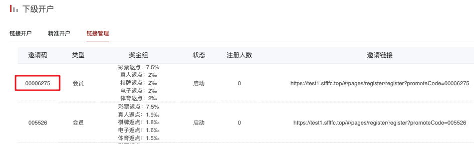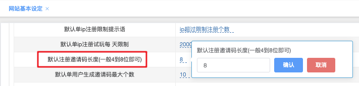 ⚠️ 特别说明: 此设定决定系统自动生成邀请码的位数,建议设定范围为4~8位。修改后仅影响新生成的邀请码,已存在的邀请码长度不受影响。邀请码可于前台「代理中心 → 下级开户 → 链接管理」页面查看。