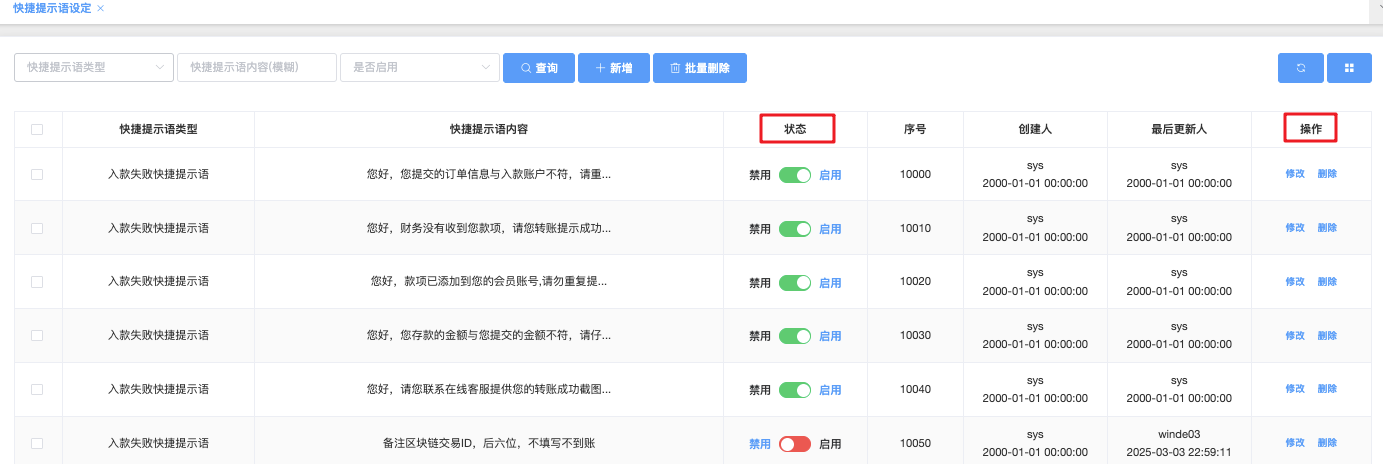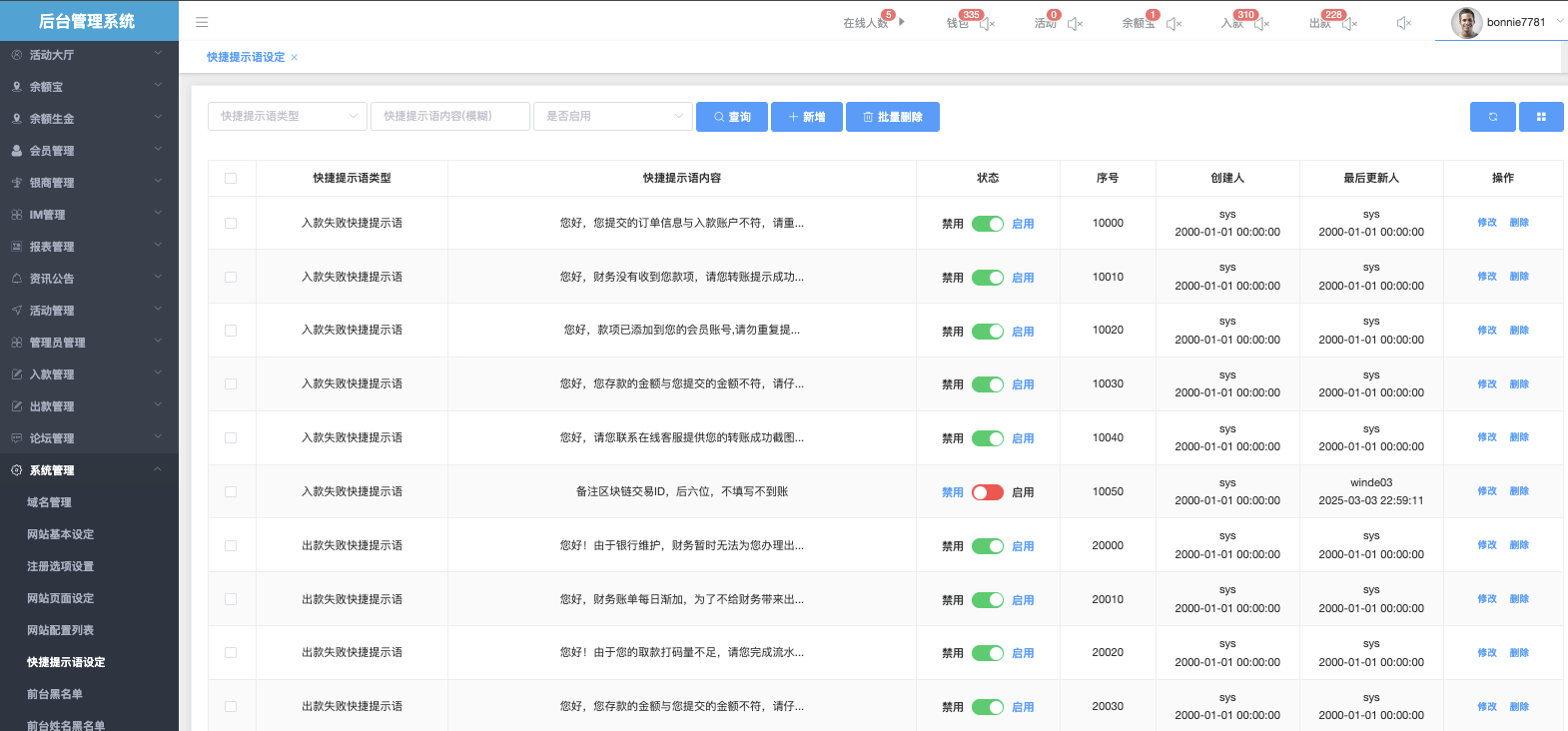 - 快捷提示语类型:入款失败快捷提示语、出款失败快捷提示语