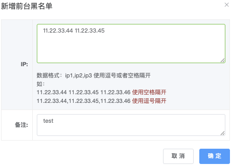 - 填写完成后点击「确定」保存,所填IP即刻生效进入黑名单。