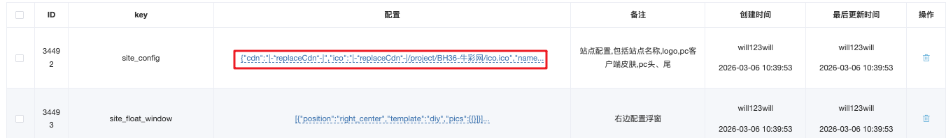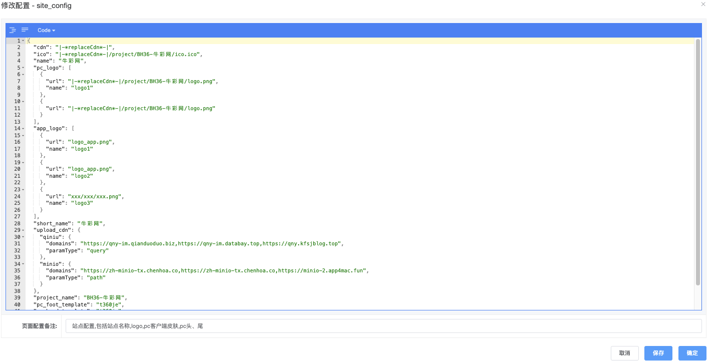 本页面用于管理网站各项功能的JSON配置内容,涵盖站点基础信息、浮窗、注册页、三方平台、路由等核心配置项