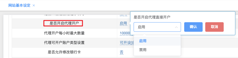 ⚠️ 特别说明: 设定为「启用」时,代理可于前台「精准开户」页面直接建立下级账户,Web版与H5版均显示此功能;设定为「禁用」时,精准开户入口将隐藏。