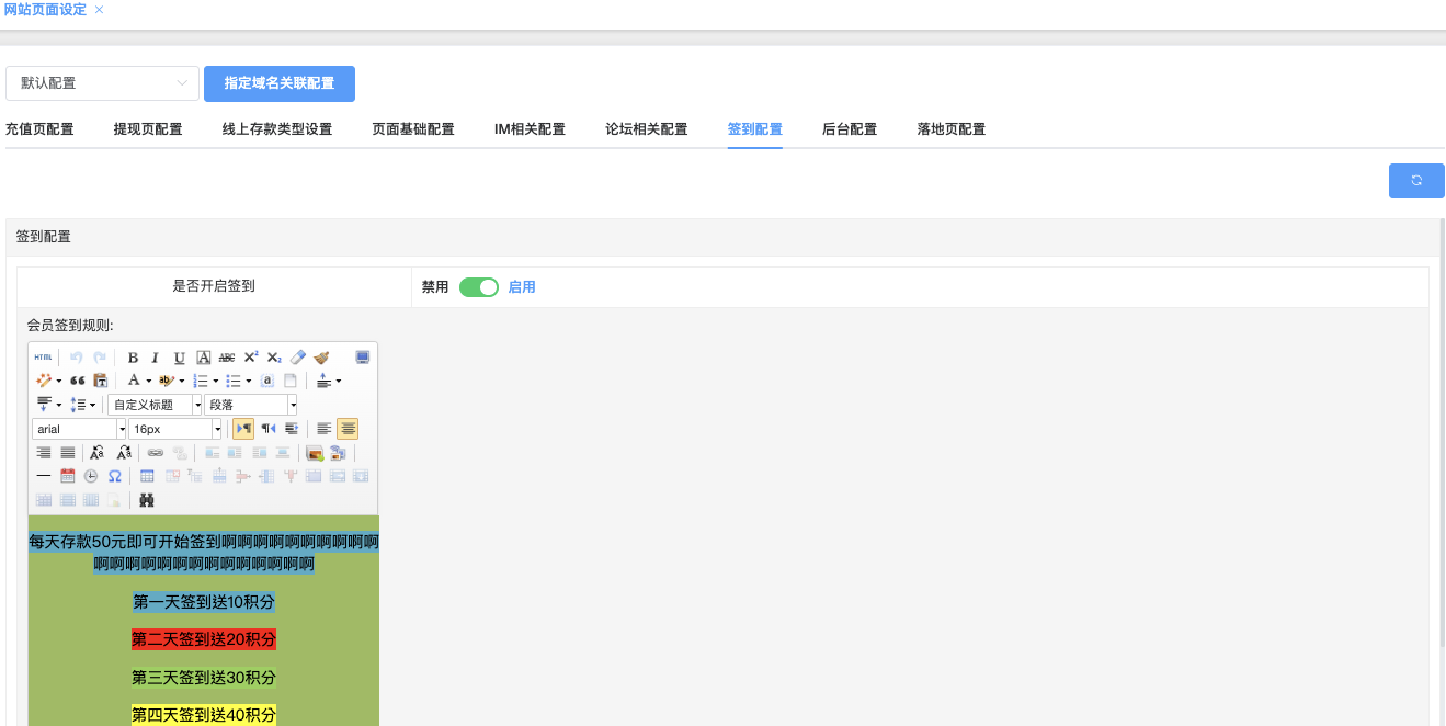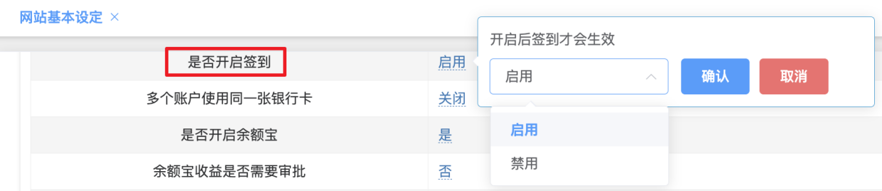 是否开启签到:绿色“启用”开关 / 红色“禁用”开关(当前启用)