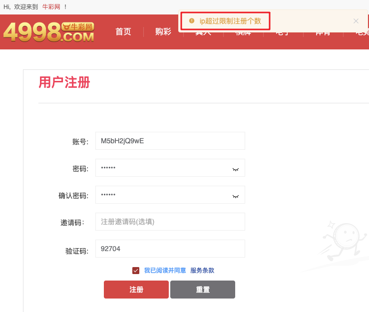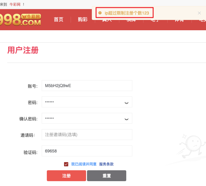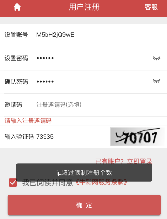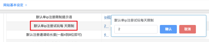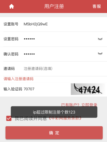 - 默认单IP注册限制提示语:ip超过限制注册个数123