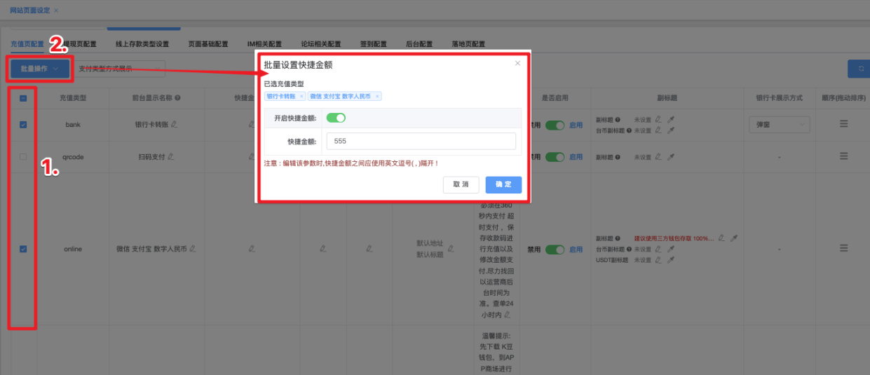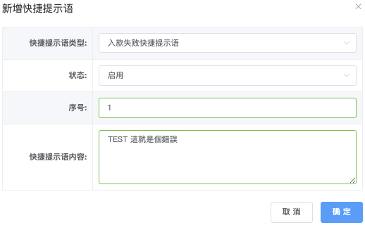 - 快捷提示语类型:下拉选择(必填,从下拉选单中选择「入款失败」或「出款失败」)