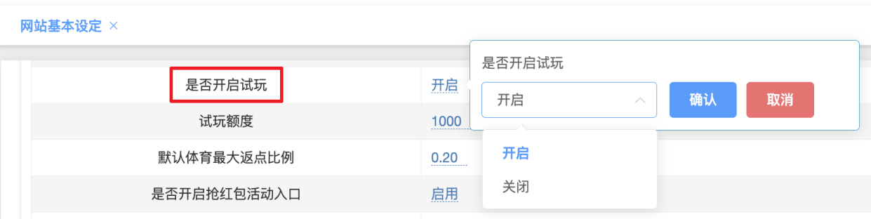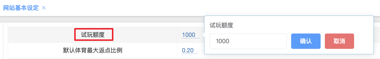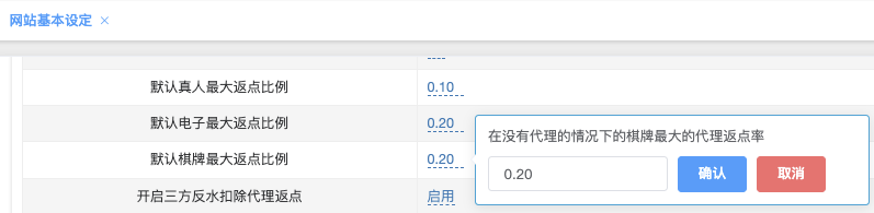 - 默认 真人 / 电子 / 棋牌 最大返点比例:0.20