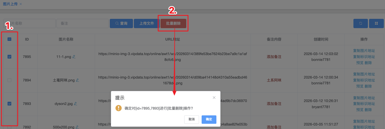 - 点击「批量删除」按钮,系统弹出确认窗口,显示:确定对[id=7895,7893]进行[批量删除]操作?