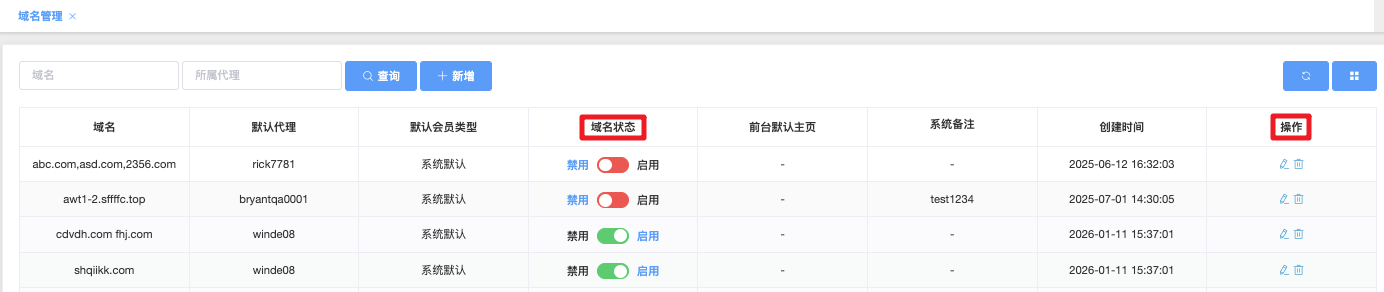- 「域名状态」:禁用(红色) / 启用(绿色)