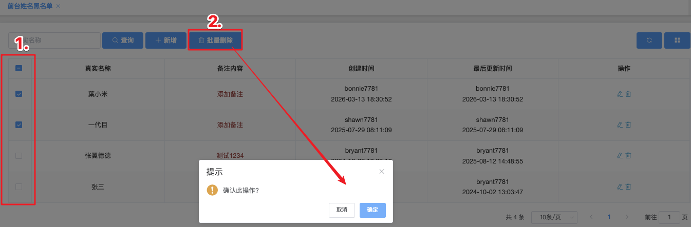 - 填写完成后点击「确定」保存,该姓名即刻生效进入黑名单。