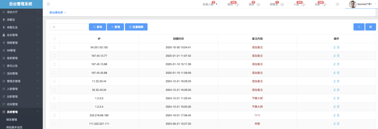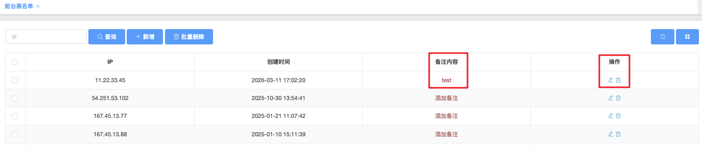 本页面用于管理被封锁的IP地址,列入黑名单的IP将无法访问前台页面,适用于封锁恶意访问、爬虫或异常流量来源。