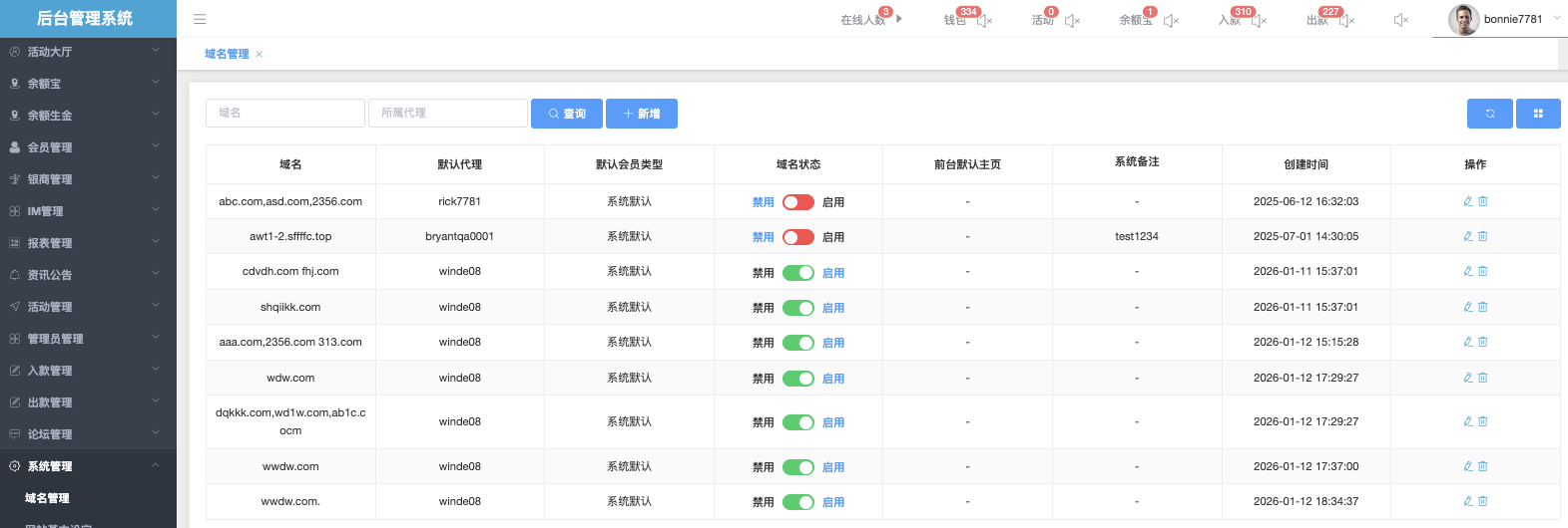 这个页面用于统一管理和维护平台支持的所有绑定域名。管理员可以在这里添加新域名、设置每个域名的默认代理、默认会员类型、前台首页、状态(启用/禁用),以及系统备注。