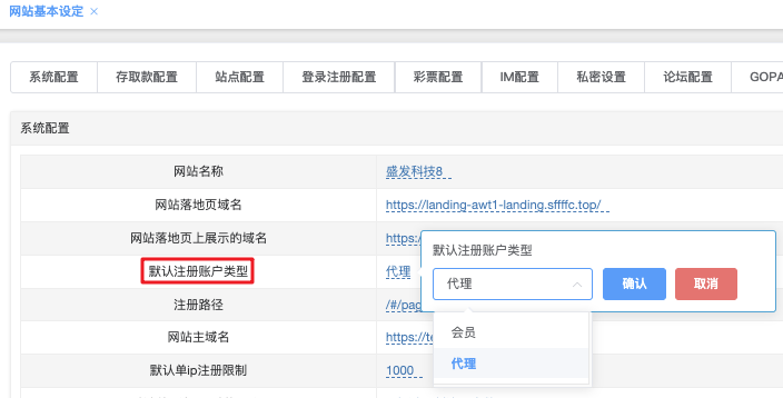 - 默认会员类型 → (下拉)选择会员、代理(当前选项为“系统默认”)