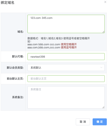 - 域名 → 必填,支持批量输入(用空格或逗号分隔多个域名,如 123.com 345.com 345com)