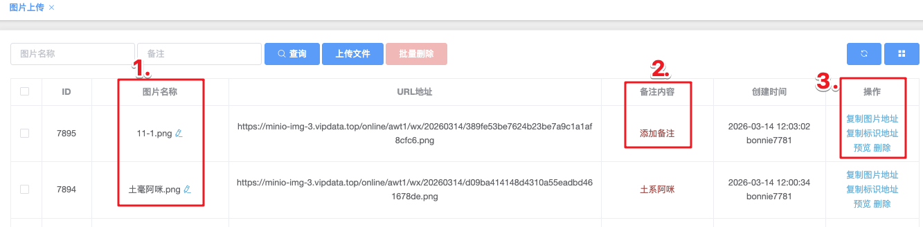 *目前仅支持 jpg、png、gif、mp3 格式的文件,上传完成后系统自动生成对应的URL地址并显示于「列表中」。